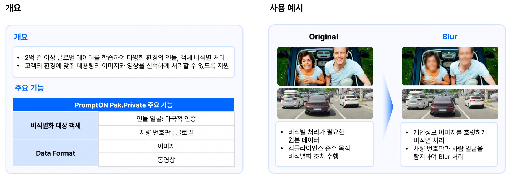 PromptON Pak.Private은 얼굴, 차량 번호판 등 영상 속 민감한 개인정보를 AI 기술로 자동으로 탐지하고 비식별화합니다.