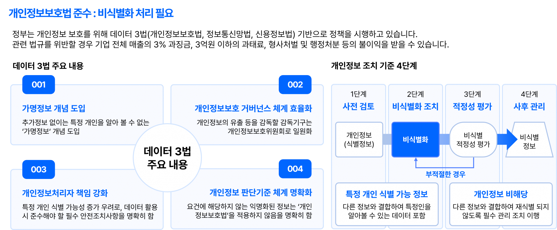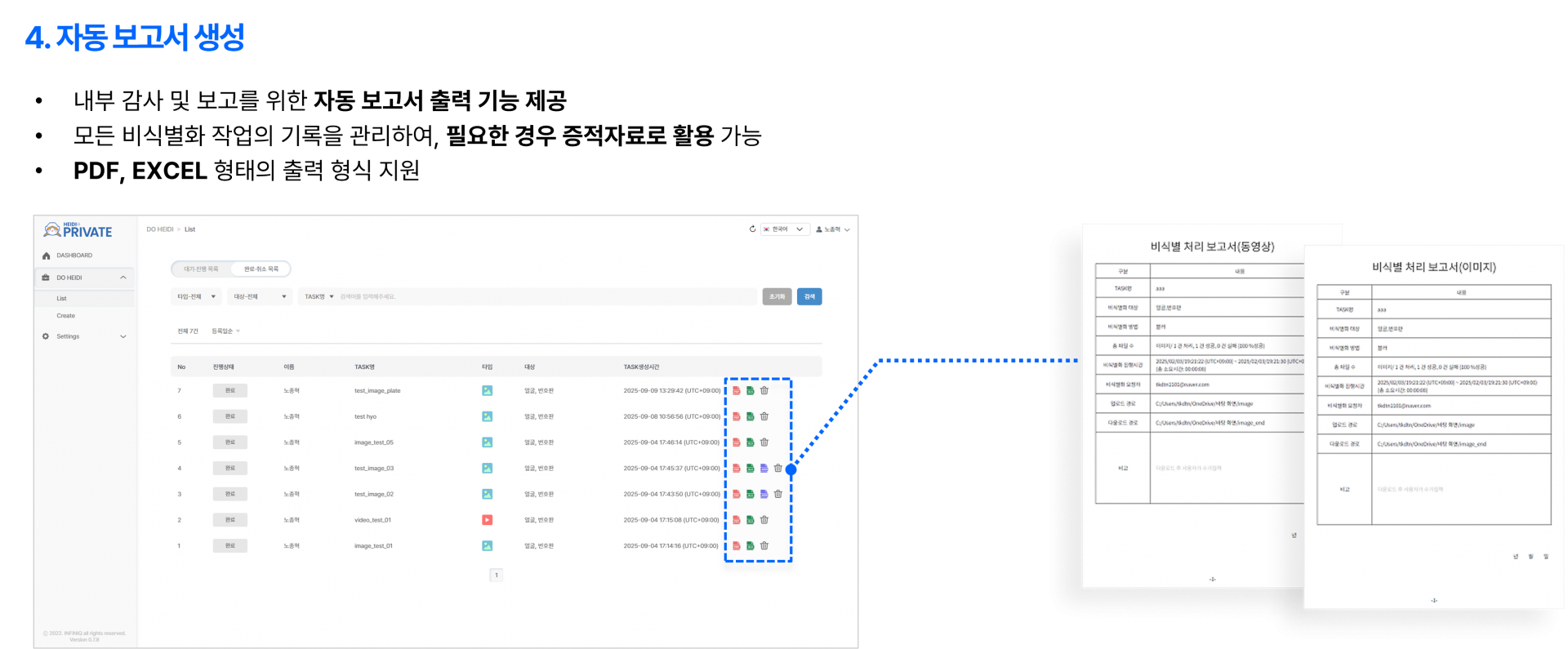 비식별 처리 내역은 자동 보고서로 생성되어 관리자가 개인정보 보호 현황을 한눈에 모니터링할 수 있습니다.